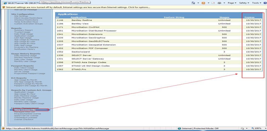 【问题描述】Select用户,无论是Bentley托管的Hosted Server 还是本地部署的Deployed Server 都可以通过IE登录Selectserver管理页面,来查看License相关信息,下面针对用户经常询问的查看购买的产品目录以及产品到期日,简单介绍查看方法。