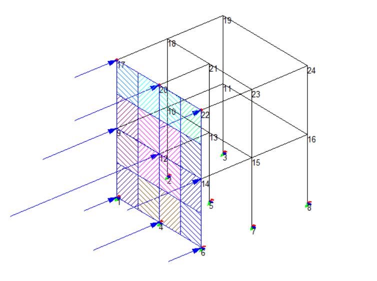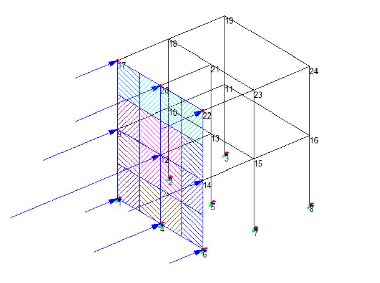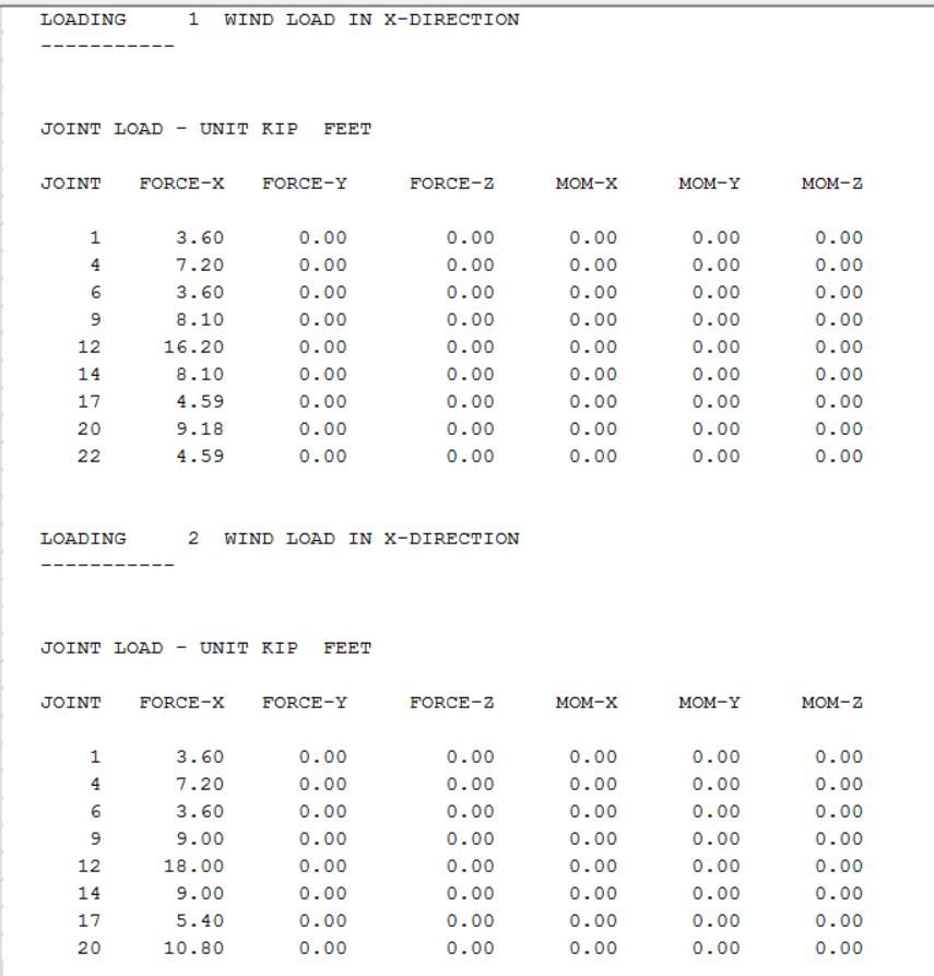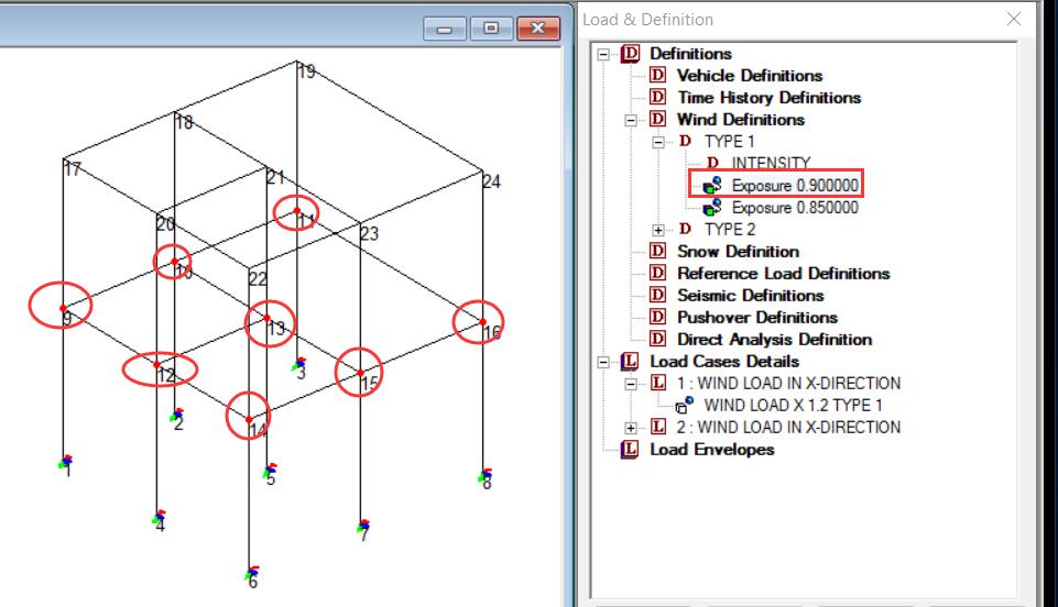 从图中可以看出,暴露系数1影响到的节点编号为9,12,14,那么我们对比荷载工况1和2可以看出工况1中的节点9,12,14对应的荷载均为工况2的0.9倍。而暴露系数2中的节点17,20,22 也可以验证为工况1中的节点17,20,22对应的荷载均为工况2的0.85倍。