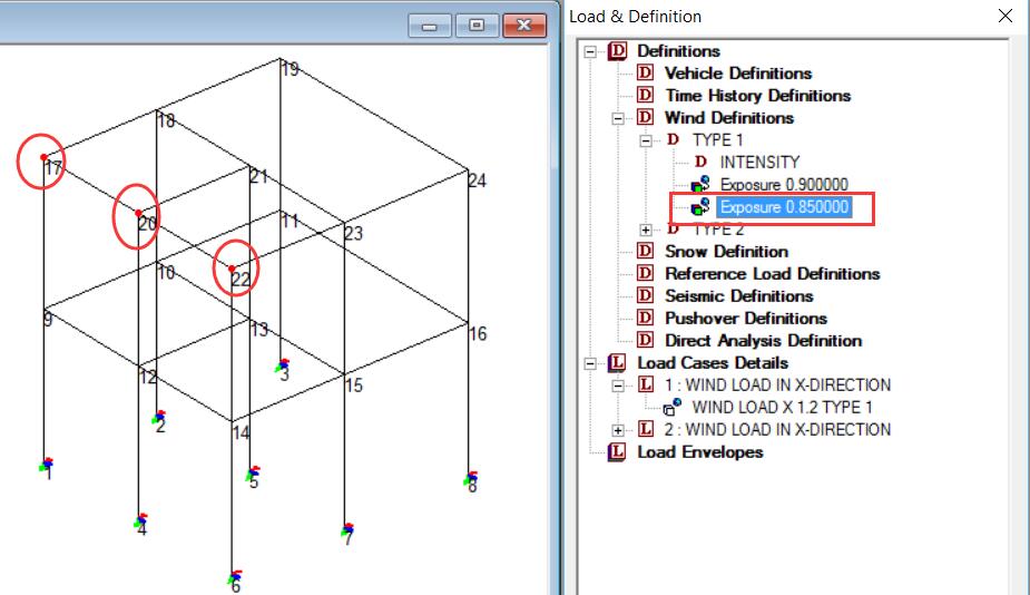 这里定义了两个风荷载类型,其中第一个引入了两个暴露系数:暴露系数1对于高度在11m-13m区间内的节点荷载折减系数为0.9;暴露系数2对于节点17 20 22荷载值折减系数为0.85。
