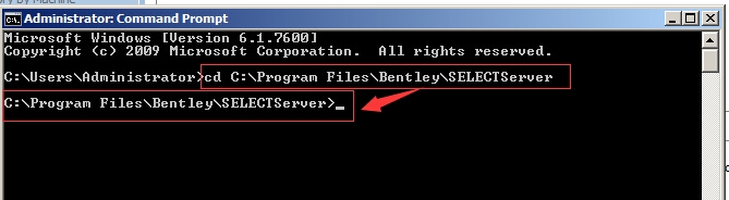 1. window开始菜单>运行>输入cmd, 调出命令行窗口,先确定Selectserver的安装路径,然后使用cd +地址的方式指定到安装路径。默认路径如下图所示,回车后如最后一行所示。