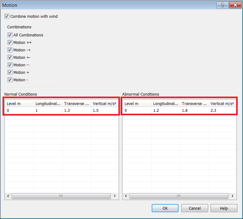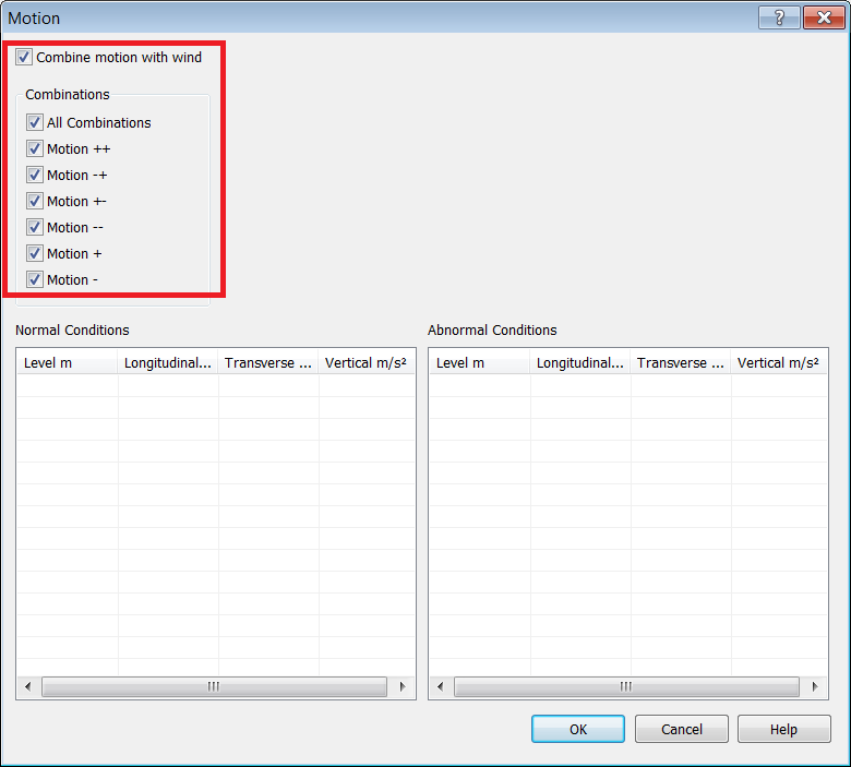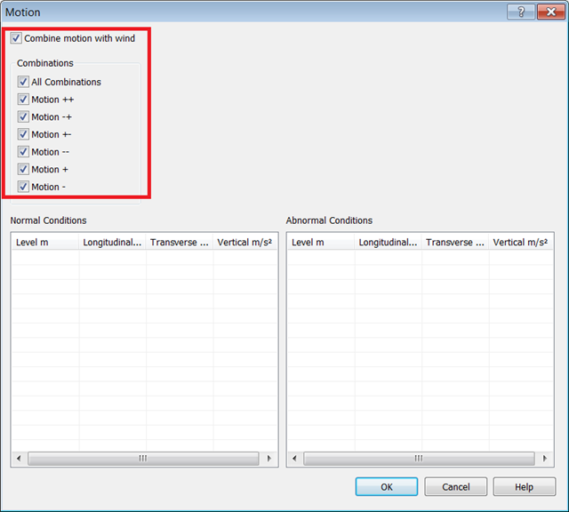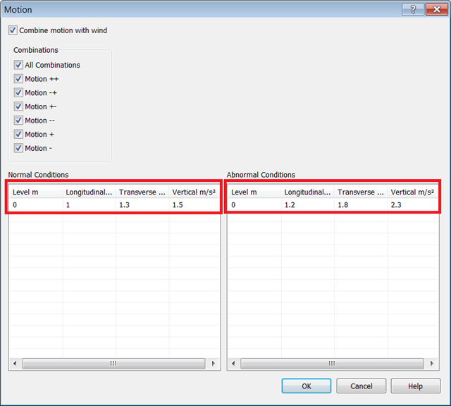 - For this horizontal Vessel, all motion combinations will be calculated. Motion will also be combined with wind. Enable all available checkboxes.