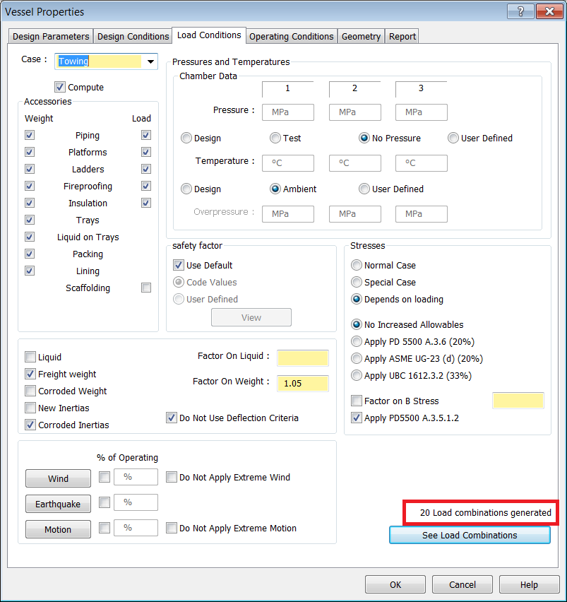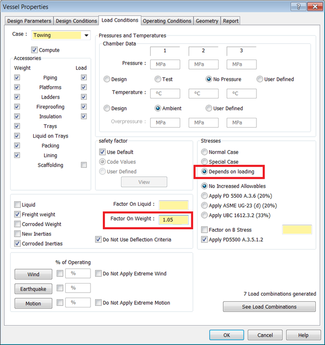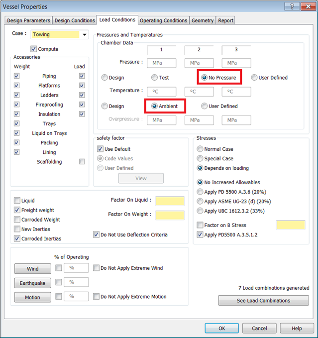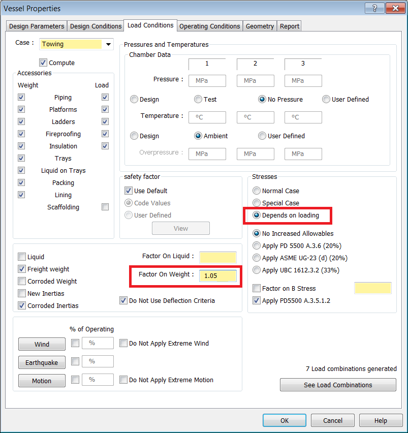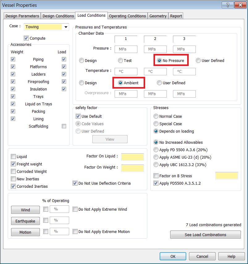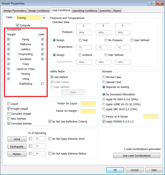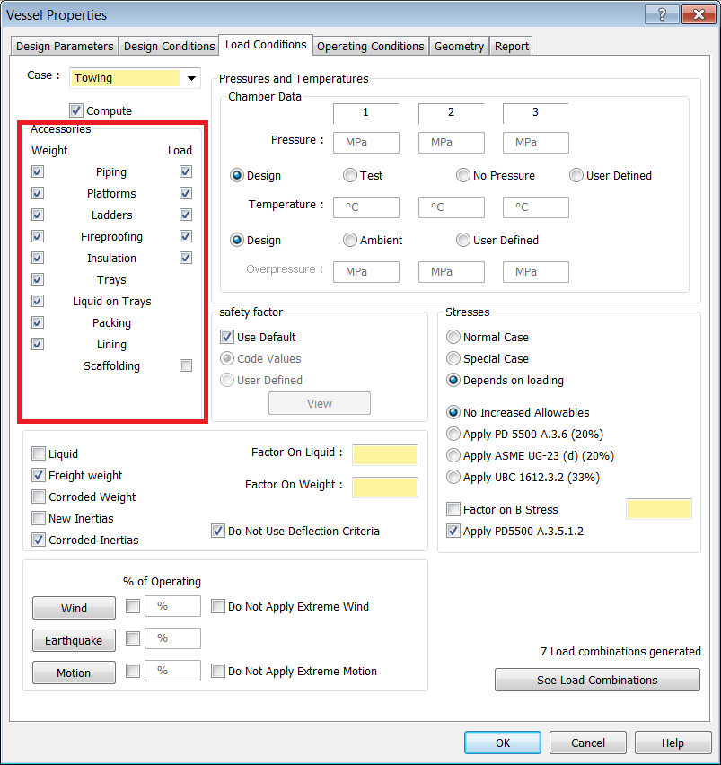 - During towing, wind and motion are applied simultaneously. For this example, the Vessel is empty, at ambient temperature, and has no pressure. Enable the Weight and Load checkboxes for all Accessories on the Vessel, with the exception of Scaffolding.
