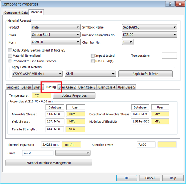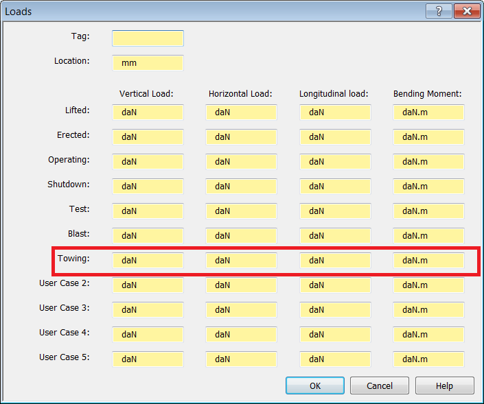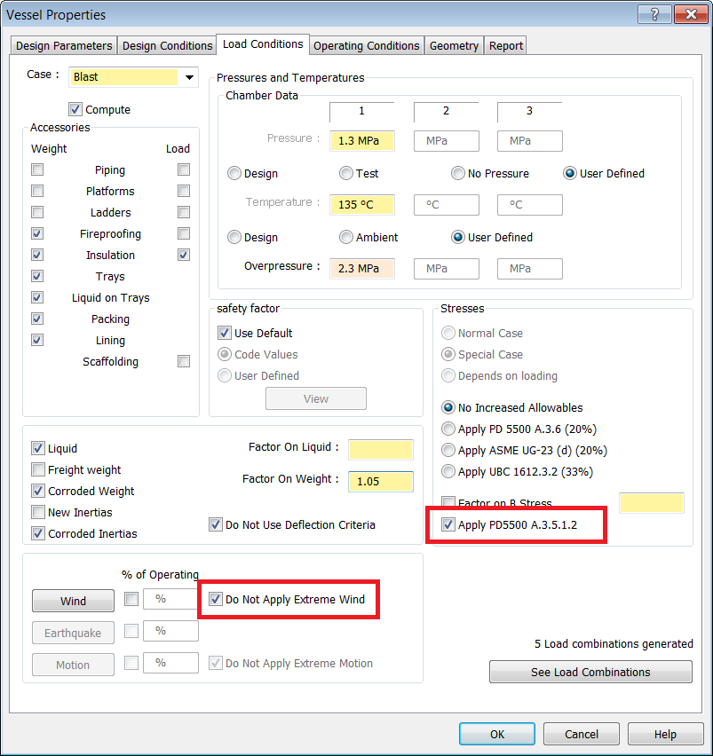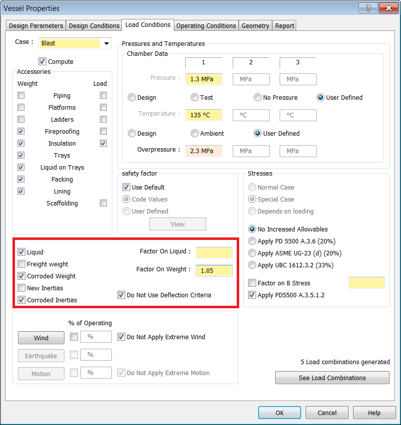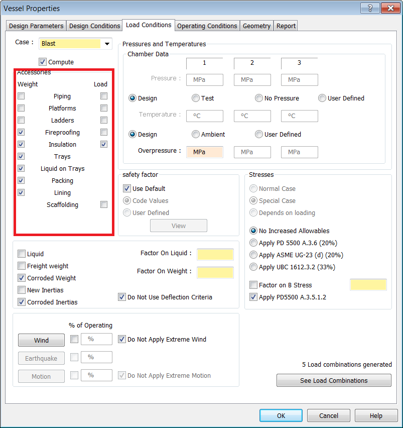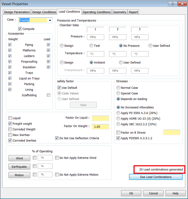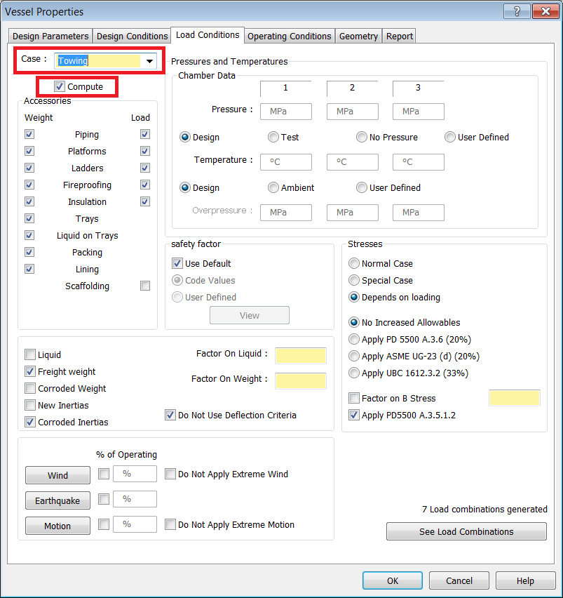 - During towing, wind and motion are applied simultaneously. For this example, the Vessel is empty, at ambient temperature, and has no pressure. Enable the Weight and Load checkboxes for all Accessories on the Vessel, with the exception of Scaffolding.