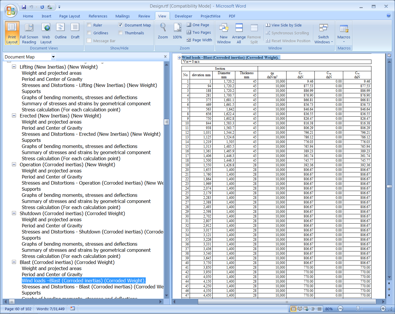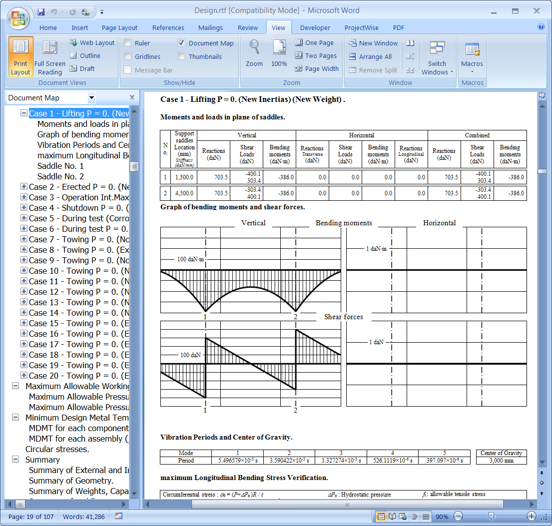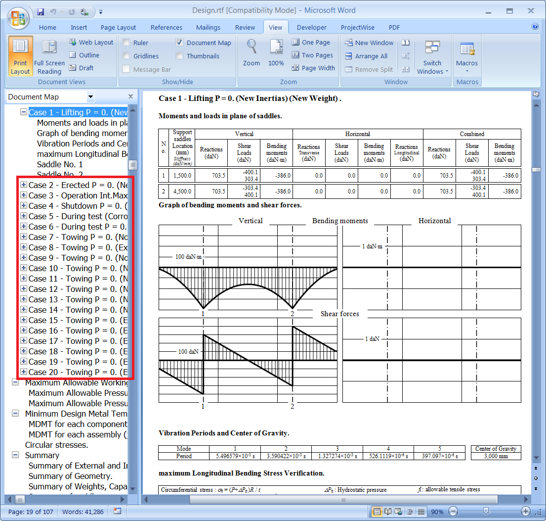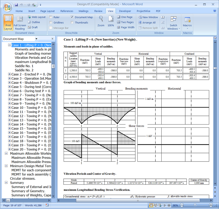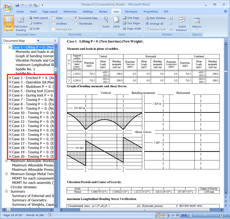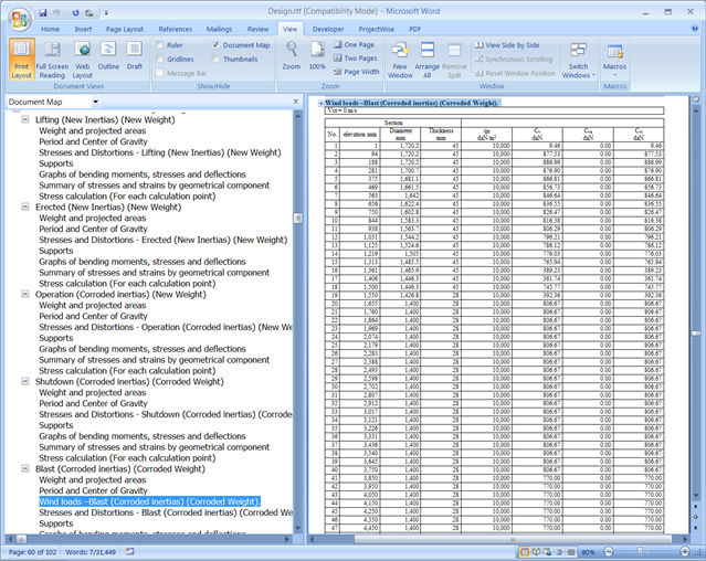 - A full calculation report is generated using the Word Processing Software Executable defined in the Preference Properties dialog (in this example, Microsoft Word). Select the View tab, then enable the Document Map checkbox (or the Navigation Pane checkbox, depending on your version of Microsoft Word).