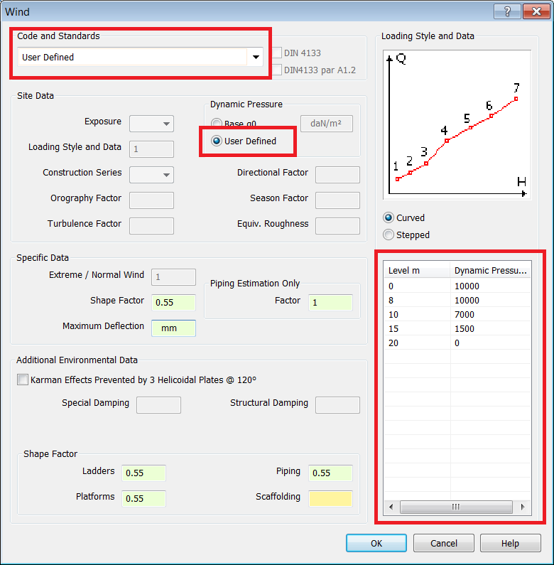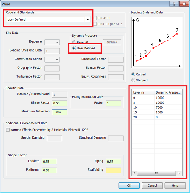 - Define Dynamic Pressures by enabling the User Defined radio button, then define the Level m and Dynamic Pressure as shown below.