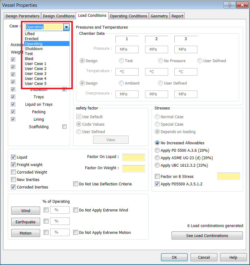 - Select the Load Conditions tab. Notice the Case drop-down pick-list provides pre-defined load cases provided by AutoPIPE Vessel.