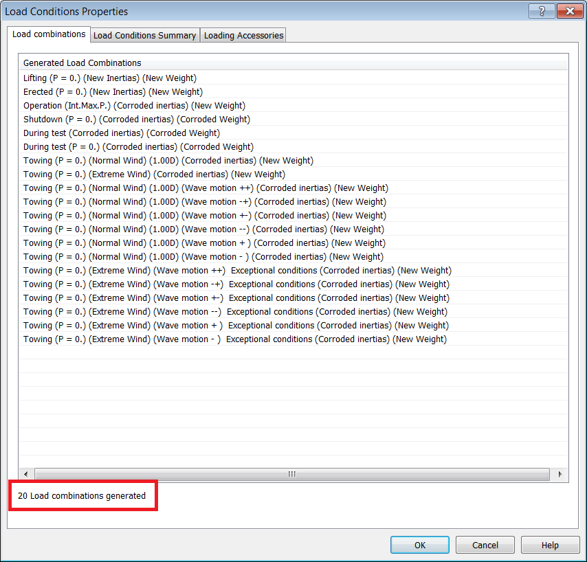 - Notice that 20 load combinations have now been defined. Press OK to return to the Load Conditions tab.