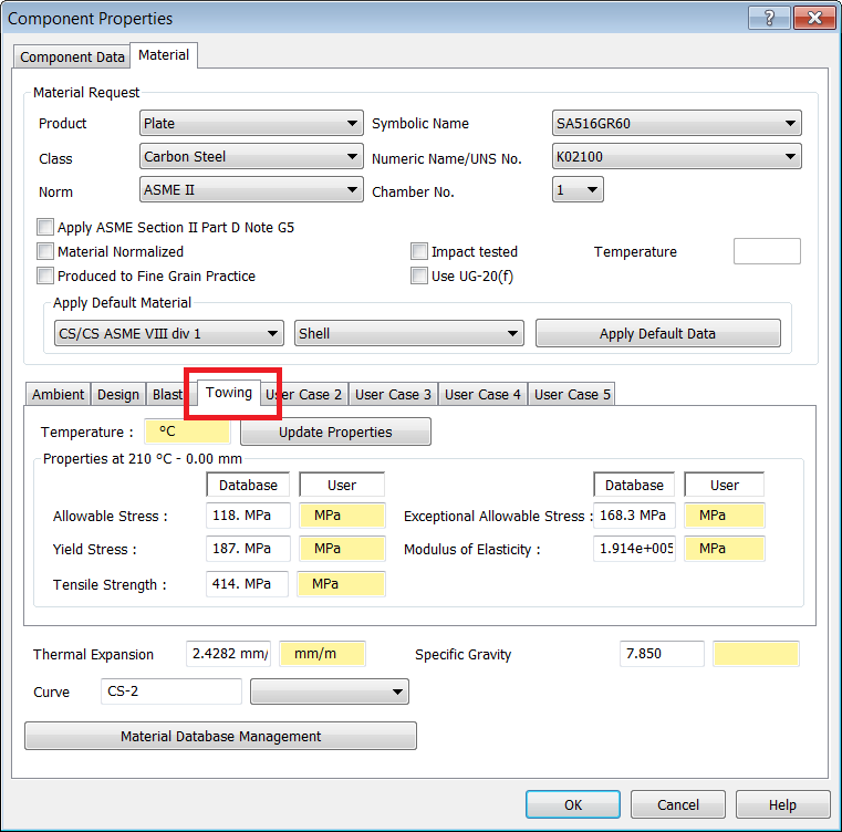 - Select the Design Conditions tab, then type 0.8 in the Internal Pressure field, then type 210 in the Internal Design Temperature field.
