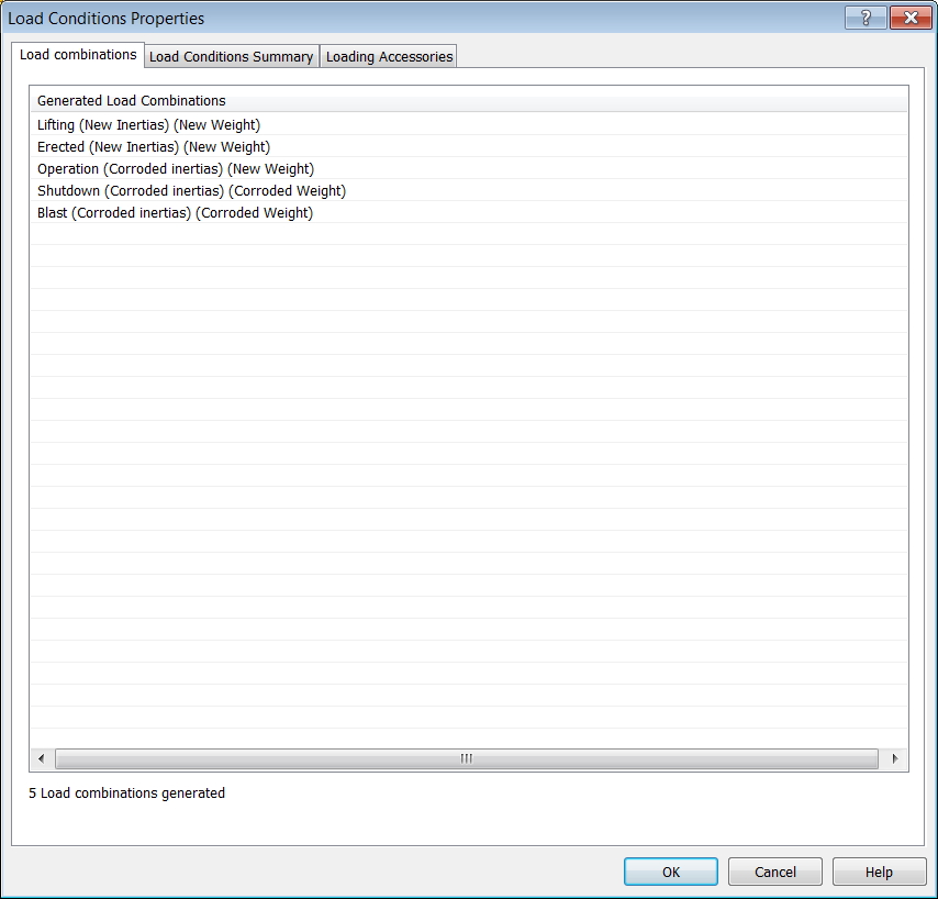 - Notice that 5 load combinations have been defined. Press OK to return to the Load Conditions tab.