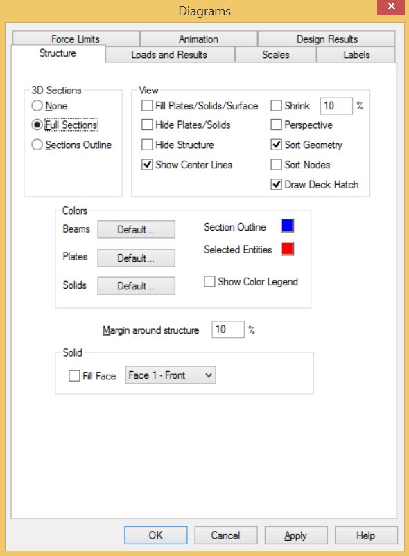 2. 在Diagrams对话框中打开Structure页面,在3D Sections框中选择Full Section,点击Apply,此时模型中的所有构件已显示截面;