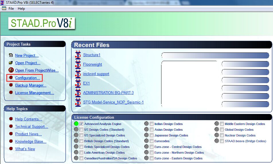 1. 启动STAAD.Pro软件,在启动页面的Project Tasks框中单击打开Configuration;