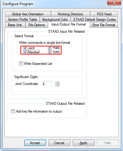 2. 在Configure Pfogram中打开Input/Output File Format分项页,在Select Format框中勾选Joint,Plate,Member,Solid,然后单击Accept;