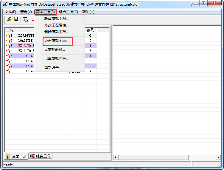 1.点击菜单“【建模】 -> 【一般结构荷载向导】”,在弹出的对话框中,选择“【基本工况】 -> 【地震荷载向导】”。