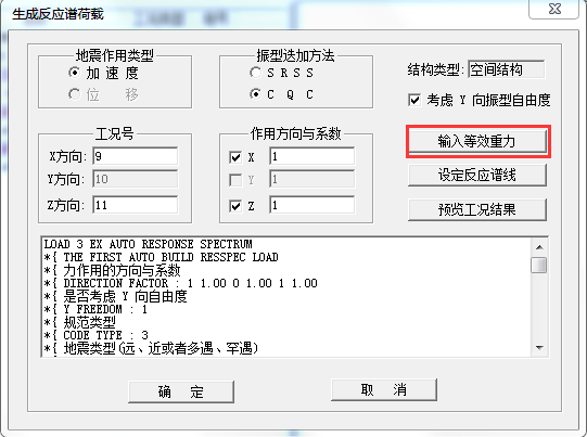 3.点击“【输入等效重力】”按钮,把用户指定的荷载转换成质量进行地震力的计算,程序默认为“1.0DL+0.5LL”作为重力荷载代表值,用户可根据需要修改。