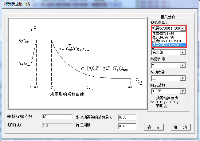 4.点击“【生成反应谱荷载】”对话框中的“设定反应谱线”按钮,在弹出的“得到反应谱曲线”对话框中选择相应的规范(目前有4种规范可供选择)、地震类型、地震分组等参数。