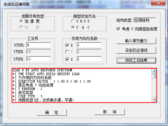 5.点击“【确定】”按钮,回到“生成反应谱荷载”对话框,点击“【预览工况结果】”,即可生成由用户指定参数生成的STAAD可以识别的命令,这些数据是对反应谱曲线的离散。