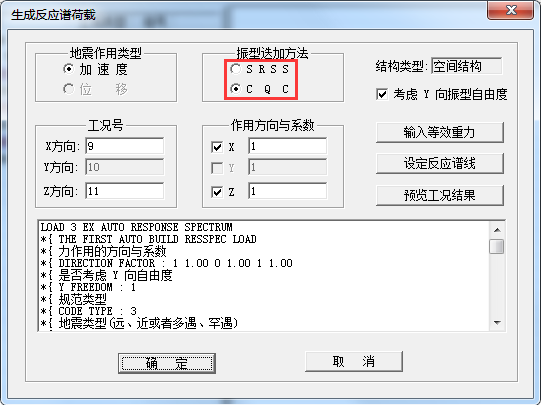 2.在弹出的“【生成反应谱荷载】”对话框中,有两种振型叠加方式可供选择:“SRSS”和“CQC”。