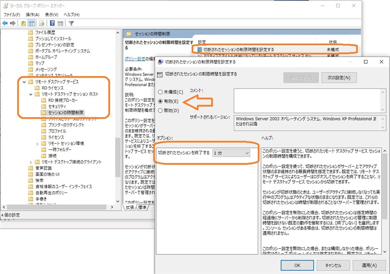 次の手順にて、定義された時間後に切断されたセッションを自動的にサインオフするようにローカルグループポリシーを構成します。
