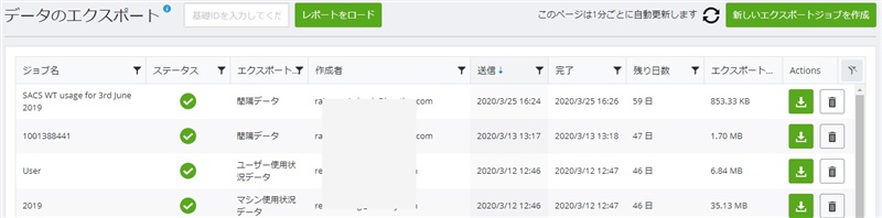 最初にページを開くと、実行されたすべてのエクスポートジョブのリストが表示されます。エクスポートジョブは、このページからダウンロードできます。 エクスポートジョブは60日間保存されます。