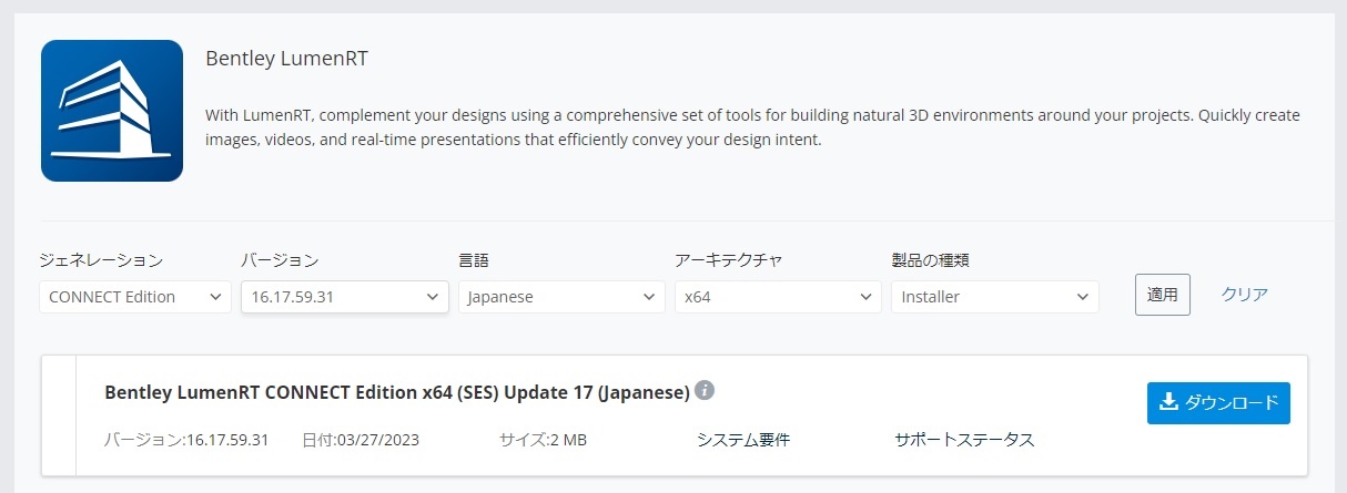 Bentley LumenRT CONNECT Edition x64 (SES) Update 17 v16.17.59.31 日本語版がリリースされました。