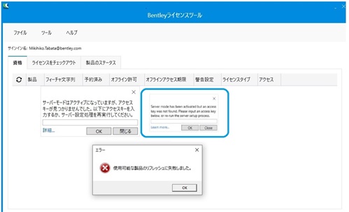 サーバーモードにBentleyライセンスツールが設定されている場合、以下のメッセージが表示され、キーが設定されていないと正常動作しません。