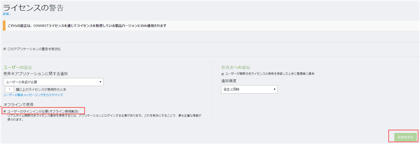 ※オフライン状態での使用を認めない「ユーザーのサインインが必要(オフライン使用無効)」をチェックオンにしてください。