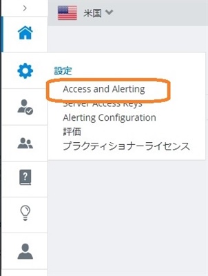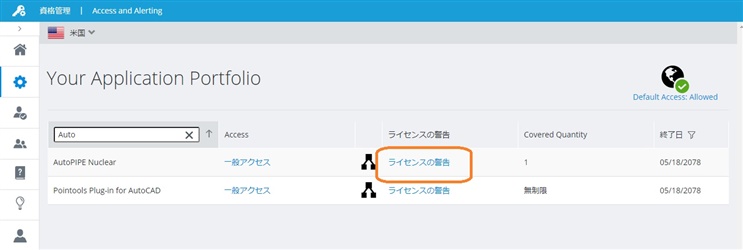 2.資格管理>設定アイコンより、Access and Alerting(ライセンスの警告)の順でクリックします。