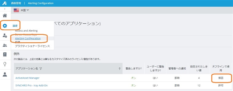 5.設定に戻り、Alerting Configuration(警告設定の状態)より、最後の列にある「オフラインで使用」より「拒否」に設定されている事を確認できます。