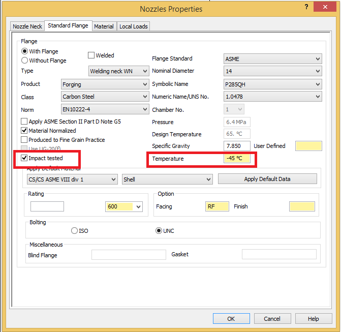 In the nozzle standard flange and materials tab, the "Impact Tested" option has been checked and the impact test temperature mentioned to be -45C.