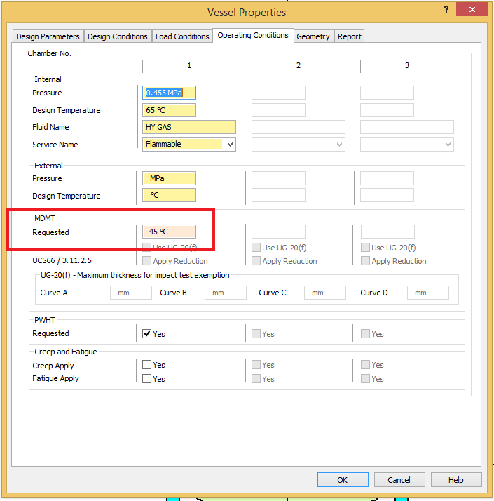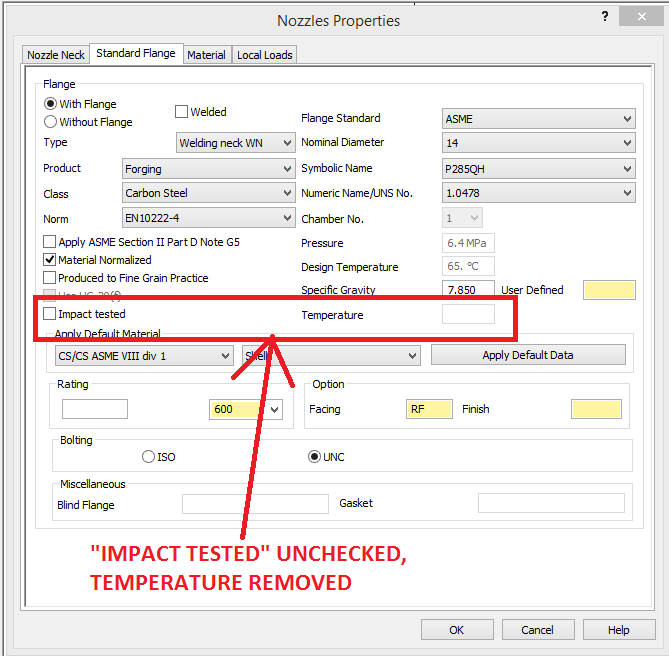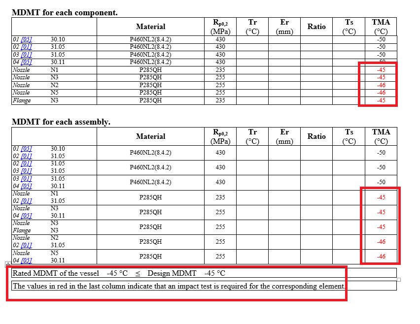 In the above example, if the impact tested field is unchecked and the temperature removed from the nozzle standard flange and material tab, then the minimum calculated temperature which would not require impact test for the nozzle is calculated to be -20C which is more than the requested MDMT (-45C).