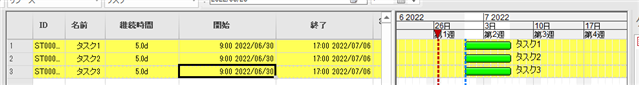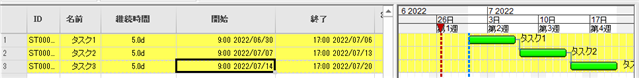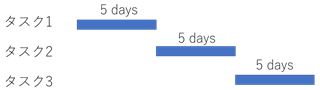 結果は以下のイメージになります。関連付けは、ガントチャートで関連付け(チェーン)は水色の矢印で表示されています。