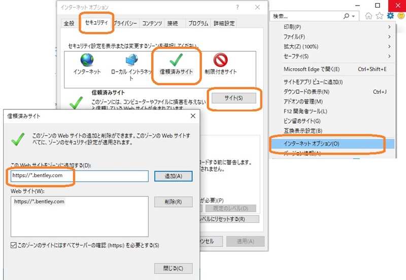 IEより、インターネットオプションを選択し、信頼済みサイトに「https://*.bentley.com」を追加します。