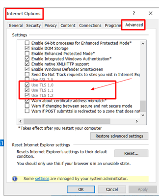 上記インターネットオプション>詳細設定タブにて、以下のTLS( データを暗号化し安全にやり取りを行う )を有効にします。