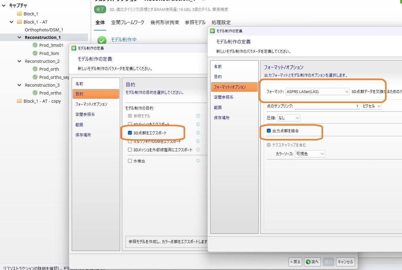 「3D点群をエクスポート」を選択し、LAS出力を行います。タイルが複数ある場合には「出力点群を結合」を選択してください。