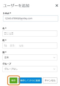ユーザーのメールアドレス、名前、ローマ字を入れ、「保存」を押します。