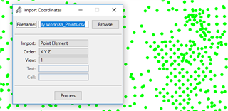 Define the filename containing the XY(Z) coordinates, what element to create (point, text or cell) the order and the view. Then click Process. The imported points are added to the file using your current element attributes.