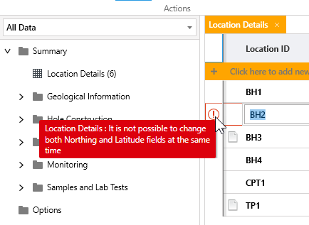 Note:It is only possible to edit E/N or Lat/Long values and you will not be able to edit E and Long, N and Lat or E/N and Lat/Long at the same time. If attempted a validation error message will be displayed.