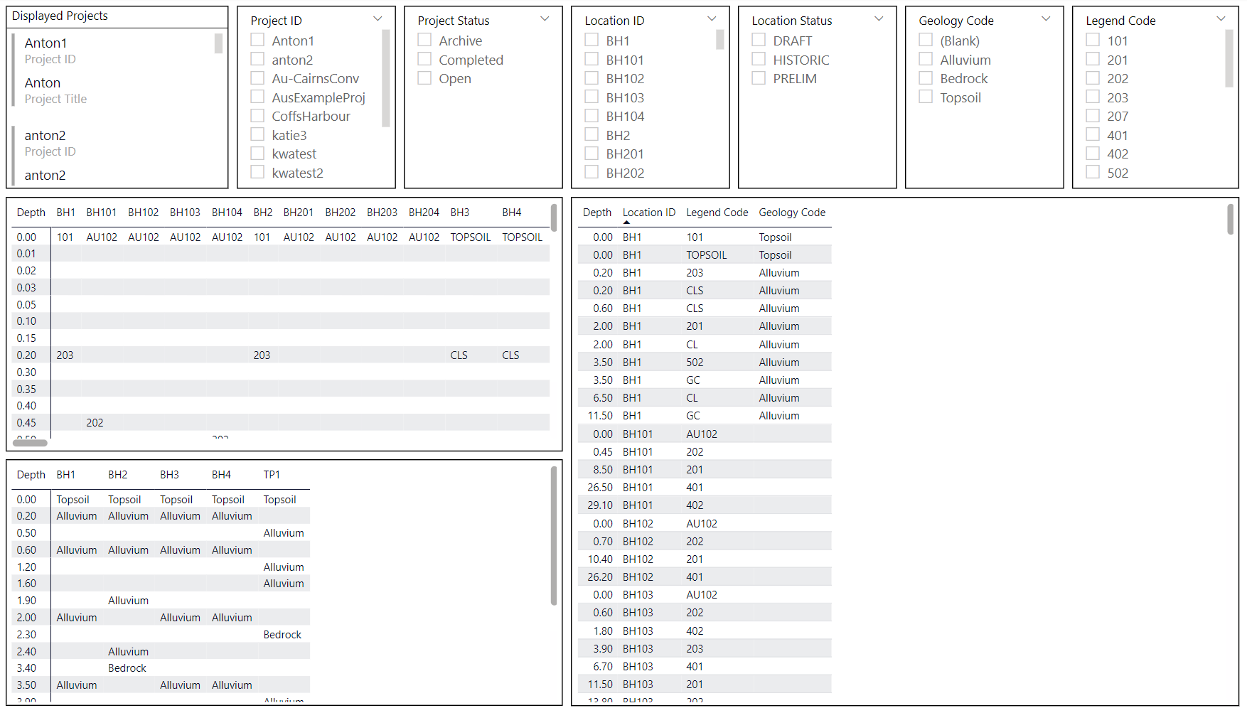 This report connects data using a normally hidden Globally Unique ID (GUID) that OpenGround relies on in the background to reduce conflicts between same-named entities (multiple BH-01 locations in each project) for example. This is then connected to the parent table that lives above (Generally Location Details or Sample Information tables). It is important to include that parent level ID in the query to link backwords to the parent table.