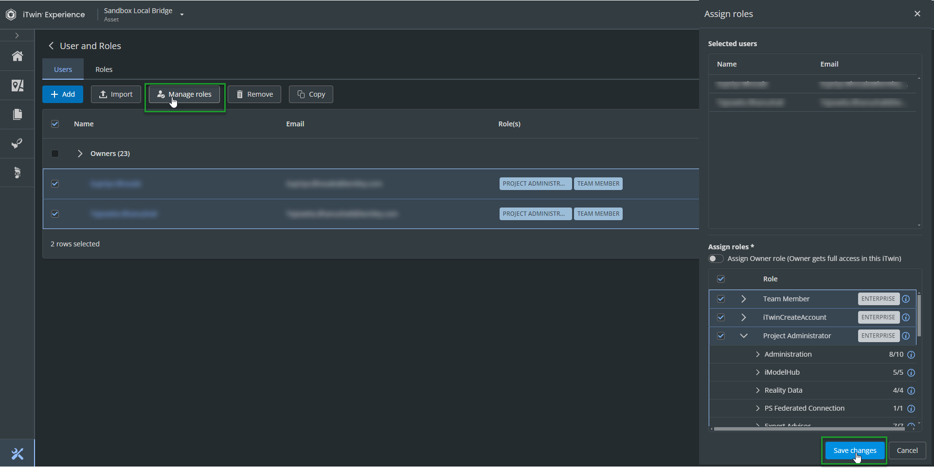 The Users and Roles page is where you grant the access capabilities to your iTwin (portfolio/Asset/project) for users.