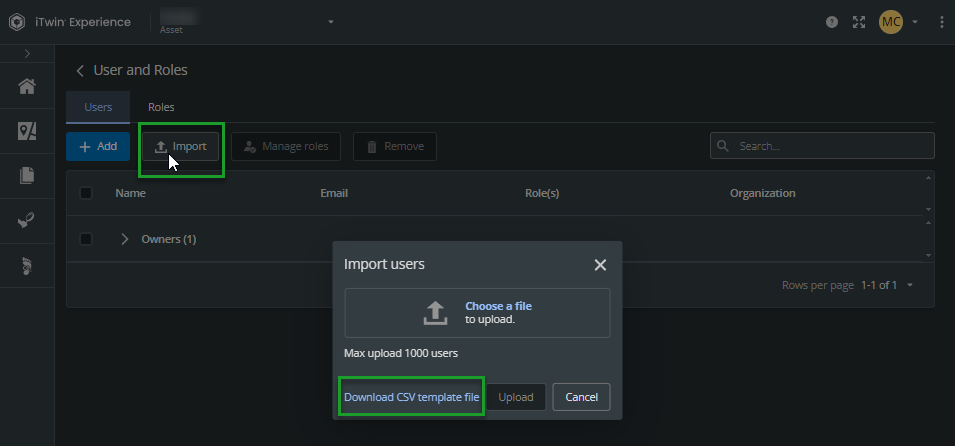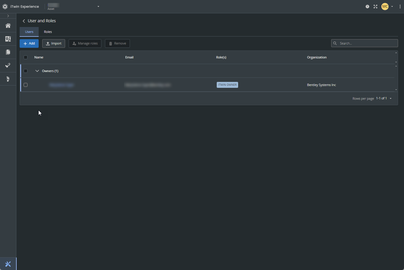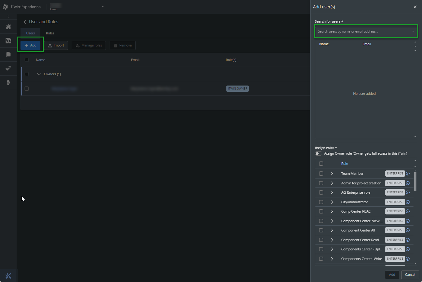 By default, no user or role is assigned to the active iTwin, except the owner of the iTwin, the person who created the iTwin.