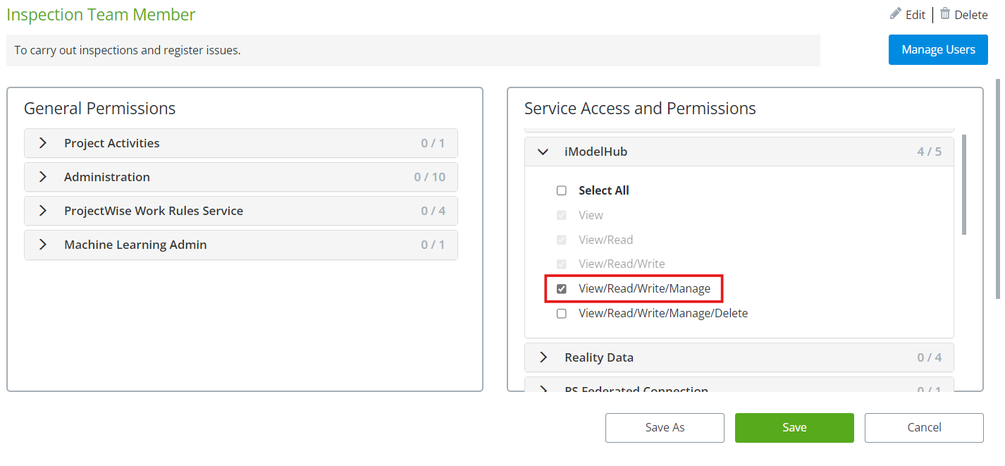3. Select "View/Read/Write/Manage" from "iModelHub" section.