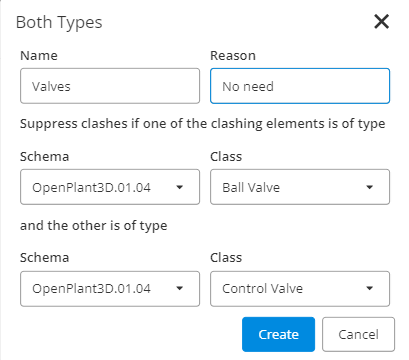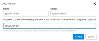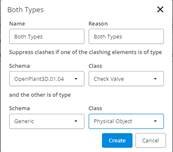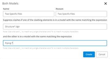 Suppress clashes if one of the clashing elements is in a model with the name matching the regular expression "", is in a file with the name matching the regular expression "", and has a logical name matching the regular expression "" and the other is in a model with the name matching the regular expression "", is in a file with the name matching the regular expression "" and has a logical name matching the regular expression "".