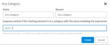 Suppress a clash if one of the clashing elements is in a category that matches the regular expression <RegEx> and the other clashing element is in a category that matches the regular expression <RegEx>