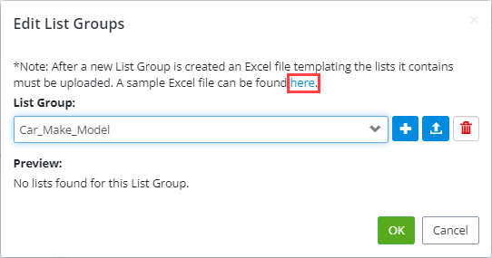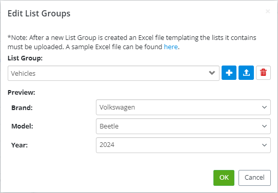 - When editing an existing list group such as Vehicles, you can make changes to the value of the existing list group by uploading an updated excel document. The Preview section shows the master list, and the sub lists current values. We can select a Brand (master list), and see what option appears in Model (sublist 1), what option appears in Year (sublists 2).
