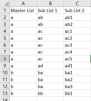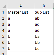 - To upload the list, we need to prepare the data in excel. Data can be prepared in multiple columns. The first Column is the Master List, and other columns are the Sub List. The first Row will be the Column Name.
