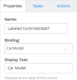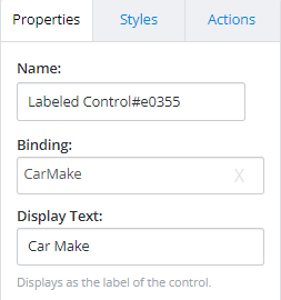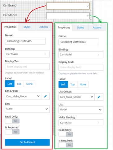 - Next, the Bindings must be created for each Cascading control. For this example, the Display Text Car Make and Car Model can be copied for the bindings.