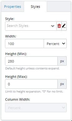 - You can edit the appearance of the Grid Control from the Style Pick from an existing Style or create a new Style. You can enter the width of the entire grid in the Width field. In the Height fields you can enter the Min and Max height of the entire grid. In the Column Width field, you can enter the minimum width of each column.
