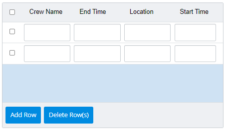 - Once the Grid Control is published users can add rows by clicking Add Row Or delete single or multiple rows by checking off the box beside the row and clicking the Delete Row(s) button. To add information to the columns, select the required cell and enter the information or pick from the dropdown or date picker.