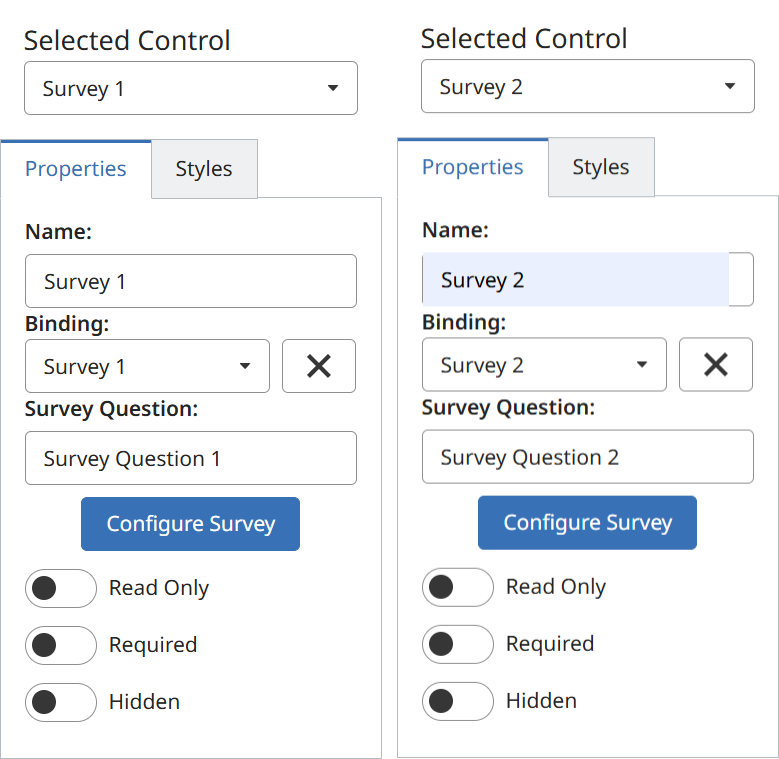 - Each survey control will have a unique Name and Binding.