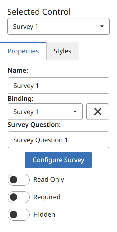- Click Configure Survey from the Properties tab to customize the content of the survey control.